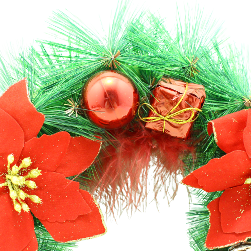 Decora tu hogar esta temporada con una corona navideña que aporta calidez y tradición. Su diseño elegante con flores de pascua y piñas es perfecto para dar la bienvenida a tus invitados y crear un ambiente festivo en cualquier rincón del hogar.